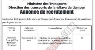 اعلان عن توظيف مديرية النقل لولاية تلمسان ads تعلن مديرية النقل لولاية تلمسان عن فتح مسابقة توظيف على اساس الشهادة في الرتب المبينة ادناه مفتش رئيسي في النقل البري عدد المناصب 02 منصب نمط التوظيف مسابقة على اساس الشهادة ملف المسابقة على أساس الشهادة …