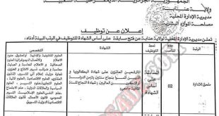 اعلان عن توظيف ads اعلانات توظيف بالولايات التالية وهران، مستغانم، تلمسان، النعامة الجلفة التفاصيل كاملة مرفقة ادناه معهد رصد مياه الأمطار للتكوين والابحاث يعلن معهد رصد مياه الأمطار للتكوين والابحاث عن فتح مسابقة توظيف على اساس الشهادة في الرتب المبينة ادناه استاذ مساعد قسم …
