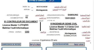 الملحقة المحلية للتشغيل مستغانم عرض عمل شركة سامسونج SAMSUNG الجزائر ads تعلن الملحقة المحلية للتشغيل مستغانم عن عرض عمل بشركة سامسونج SAMSUNG الجزائر كما موضح ادناه الهيئة المستخدمة شركة سامسونج SAMSUNG الجزائر المنصب المطلوب: ingenieur genie civil عدد المناصب: 02 الشهادة/المستوى الدراسي/الكفاءات/المتطلبات : licence/master …