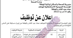اعلان عن توظيف المؤسسة العمومية الاستشفائية محاد عبد القادر بالجلفة ads تعلن المؤسسة العمومية الاستشفائية محاد عبد القادر بالجلفة عن فتح مسابقة توظيف على اساس الشهادة في الرتب المبينة ادناه طبيب عام في الصحة العمومية عدد المناصب 02 منصب نمط التوظيف مسابقة على اساس …