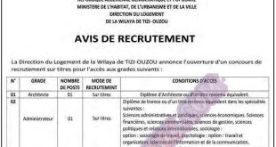 اعلان عن توظيف مديرية السكن لولاية تيزي وزو ads تعلن مديرية السكن لولاية تيزي وزو عن فتح مسابقة توظيف على اساس الشهادة في الرتب المبينة ادناه مهندس معماري عدد المناصب 01 منصب نمط التوظيف مسابقة على اساس الشهادة متصرف عدد المناصب 01 منصب نمط …