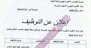 اعلان عن توظيف مركز التكيون المهني والتمهين يخلف مولود الصومعة بالبليدة ads تعلن مركز التكيون المهني والتمهين يخلف مولود الصومعة بالبليدة عن فتح مسابقة توظيف على اساس الاختبار المهني في الرتب المبينة ادناه عون خدمة من المستوى الاول عدد المناصب 01 منصب نمط التوظيف …