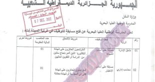 اعلان عن توظيف المدرسة الوطنية العليا البحرية ads تعلن المدرسة الوطنية العليا البحرية عن فتح مسابقة توظيف على اساس الشهادة في الرتب المبينة ادناه ملحق الادارة عدد المناصب 01 نمط التوظيف مسابقة على اساس الشهادة محاسب اداري عدد المناصب 01 نمط التوظيف مسابقة على …
