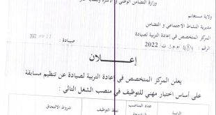 اعلان عن توظيف المركز المتخصص في إعادة التربية صيادة ولاية مستغانم ads يعلن المركز المتخصص في إعادة التربية صيادة ولاية مستغانم عن فتح مسابقة توظيف على اساس الاختبار المهني في الرتب المبينة ادناه حارس متعاقد بعقد غير محدد المدة بالتوقيت الكامل عدد المناصب 01 …