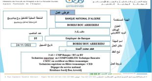 الملحقة المحلية للتشغيل برج بوعريريج عرض عمل البنك الوطني الجزائري BNA ads تعلن الملحقة المحلية للتشغيل برج بوعريريج عن عرض عمل بالبنك الوطني الجزائري BNA في المناصب المبينة ادناه CAISSIER عدد المناصب 01 نوع العقد عقد محدد المدة JURISTE عدد المناصب 01 نوع العقد …