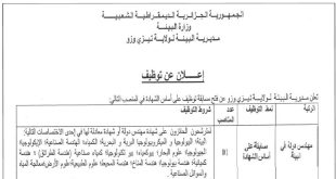 اعلان عن توظيف مديرية البيئة لولاية تيزي وزو ads تعلن مديرية البيئة لولاية تيزي وزو عن فتح مسابقة توظيف على اساس الشهادة في الرتب المبينة ادناه مهندس دولة في البيئة عدد المناصب 01 نمط التوظيف مسابقة على اساس الشهادة ملف المسابقة على أساس الشهادة …