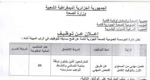 اعلان عن توظيف ادارة المؤسسة العمومية للصحة الجوارية قالمة ads تعلن ادارة المؤسسة العمومية للصحة الجوارية قالمة عن فتح مسابقة توظيف عن طريق الفحص المهني في الرتب المبينة ادناه عامل مهني من المستوى الاول بالتوقيت الكامل عدد المناصب 04 نمط التوظيف عن طريق الفحص …