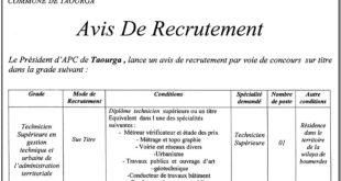 اعلان عن توظيف بلدية تاورقة بولاية بومرداس ads تعلن بلدية تاورقة بولاية بومرداس عن فتح مسابقات توظيف على اساس الشهادة في الرتب المبينة ادناه تقني سامي في تسيير تقنيات الحضرية عدد المناصب 01 نمط التوظيف مسابقة على اساس الشهادة ملف المسابقة على أساس الشهادة …