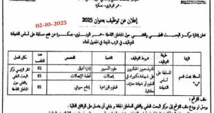وزارة التربية الوطنية مديرية التربية لولاية أدرار ads إعــــلان تعلن مديرية التربية لولاية أدرار عن توظيف أساتذة متعاقدين في اختصاص التربية البدنية للطورين الإبتدائي والمتوسط. فعلى الراغبين في التوظيف والحاصلين على شهادة الليسانس أو الماستر في الاختصاص المطلوب، التقرب من مصلحة الموظفين والتفتيش بالمديرية …