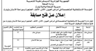 اعلان عن توظيف المؤسسة الاستشفائية المتخصصة في امراض العيون الاذن الانف الحنجرة وجراحة الاسنان بتيارت ads تعلن المؤسسة الاستشفائية المتخصصة في امراض العيون الاذن الانف الحنجرة وجراحة الاسنان بتيارت عن فتح مسابقات توظيف على اساس الشهادة في الرتب المبينة ادناه صيدلي عام في الصحة …