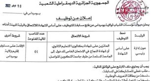 اعلان عن توظيف ديوان مؤسسات الشباب لولاية بومرداس ads يعلن ديوان مؤسسات الشباب لولاية بومرداس عن فتح مسابقات توظيف على اساس الشهادة في الرتب المبينة ادناه عون ادارة رئيسي عدد المناصب 01 نمط التوظيف مسابقة على اساس الشهادة ملف المسابقة على أساس الشهادة طلب …