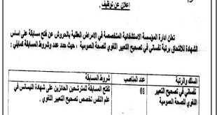 اعلان عن توظيف المؤسسة العمومية الاستشفائية بمغنية ads تعلن المؤسسة العمومية الاستشفائية بمغنية عن فتح مسابقة توظيف على اساس الشهادة في الرتب المبينة ادناه طبيب عام في الصحة العمومية عدد المناصب 05 نمط التوظيف مسابقة على اساس الشهادة ملف المسابقة على أساس الشهادة طلب …