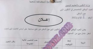 اعلان عن توظيف المعهد الوطني المتخصص في التكوين المهني عين الدفلى ads يعلن المعهد الوطني المتخصص في التكوين المهني عين الدفلى عن فتح مسابقة توظيف على اساس الاختبار المهني بعنوان السنة المالية 2022 في المناصب المبينة ادناه عامل مهني من المستوى الاول عدد المناصب …
