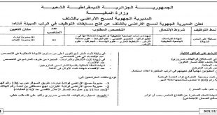 تعلن المديرية الجهورية لمسح الاراضي بولاية الشلف عن فتح مسابقات للتوظيف في الرتب المبينة ادناه ads مفتش لمسح الاراضي نمط التوظيف مسابقة على اساس الشهادة عدد المناصب 02 تاريخ نشر الاعلان : 08 ديسمبر 2021 اخر اجل لايداع الملفات 15 يوم من تاريخ الاعلان …