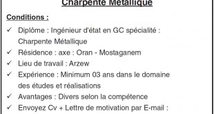 شركة وطنية هامة توظف بنواحي مستغانم وهران :✓ مهندس دولة في الهندسة المدنية تخصص “هيكل معدني” التفاصيل الكاملة موضحة ادناه ads