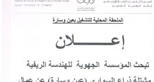 وزارة العمل و التشغيل و الضمان الاجتماعي الوكالة الوطنية للتشغيل الوكالة الوطنية للتشغيل المحلقة المحلية للتشغيل بعين وسارة ads إعلان تبحث المؤسسة الجهوية للهندسة الريفية مشتلة ذراع السواري (عين وسارة) عن عمال موسميين في الفلاحة فعلى من يهمه الأمر الاتصال بالملحقة في أقرب الآجال …