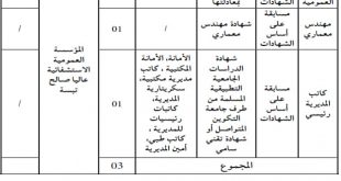 تعلن ادارة المؤسسة العمومية الاستشفائية عاليا صالح عن فتح مسابقة للتوظيف في الرتب المبينة ادناه ads صيدلي عام في الصحة العمومية عدد المناصب 01 نمط التوظيف مسابقة على اساس الشهادة مهندس معماري عدد المناصب 01 نمط التوظيف مسابقة على اساس الشهادة كاتب المديرية رئيسي …