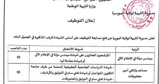 وزارة التربية الوطنية مديرية التربية لولاية البويرة إعلان التوظيف ads تعلن مديرية التربية لولاية البويرة عن فتح مسابقة توظيف على أساس الشهادة للرتب المذكورة في الجدول أدناه: الرتبةشروط الالتحاقعدد المناصبمهندس دولة في الإعلام الآليالمترشحون الحائزون على شهادة مهندس دولة في الإعلام الآلي أو شهادة …