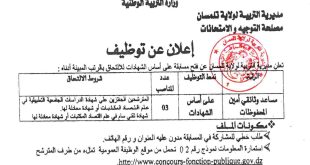 وزارة التربية الوطنية مديرية التربية لولاية تلمسان مصلحة التوجيه والامتحانات ads إعلان عن توظيف تعلن مديرية التربية لولاية تلمسان عن فتح مسابقة على أساس الشهادات للالتحاق بالمناصب المبينة أدناه: الرتبة/ الوظيفةعدد المناصبعلى أساس الشهاداتشروط الالتحاقمساعد وثائقي أمين محفوظات03المترشحون الحائزون على شهادة الدراسات الجامعية التطبيقية …