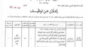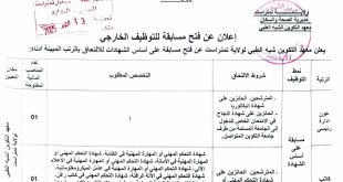 وزارة الصحة ولاية تمنراست مديرية الصحة والسكان معهد التكوين شبه الطبي ads إعلان عن فتح مسابقة للتوظيف الخارجي يعلن معهد التكوين شبه الطبي لولايـة تمنراست عن فتح اختبار مهني في الرتب المعينة أدناه: إعلان عن مسابقة توظيف بمديرية التربية اعلان عن فتح توظيف بمديرية …