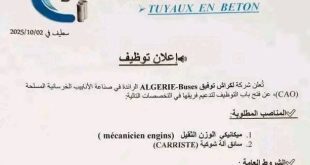 ALGERIE BUSES TUYAUX EN BETON ads سطيف في 02/10/2025 إعلان توظيف تعلن شركة لكراش توفيق ALGERIE-Buses الرائدة في صناعة الأنابيب الخرسانية المسلحة (CAO) عن فتح باب التوظيف لتدعيم فريقها في التخصصات التالية: المناصب المطلوبة: ميكانيكي الوزن الثقيل (mécanicien engins) سائق آلة شوكية (CARRISTE) الشروط …