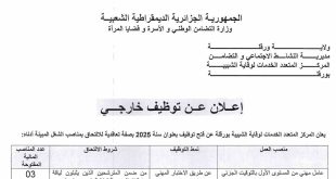وزارة التضامن الوطني و الأسرة و قضايا المرأة مديرية النشاط الاجتماعي و التضامن المركز المتعدد الخدمات الوقائية للشببية بورقلة ads إعلان عن توظيف خارجي يعلن المركز المتعدد الخدمات الوقائية للشببية بورقلة عن فتح توظيف بعنوان سنة 2025 بصفة تعاقدية للالتحاق بمناصب الشغل المبينة أدناه: …