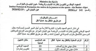 وزارة الرياضة Ministère des Sports المعهد الوطني لتكوين إطارات الشباب والرياضة – عين البنيان – الجزائر ads عين البنيان في: 2026/02/19 اعلان توظيف عن طريق التكفل بعد عملية نقل في إطار تدعيم المعهد بالموارد البشرية اللازمة من أجل السير الحسن لمصالحه، يعلن المعهد الوطني …