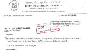 مؤسسة الصيانة الصناعية الوكالة المحلية للتشغيل والمنيعة التاريخ: 22 فيفري 2026 ads عنابة، في 18/02/2026 إلى السيد مدير الوكالة المحلية للتشغيل (ALEM) عرض عمل. يشرفنا أن نطلب منكم اقتراح، وفقاً للمتطلبات والتخصصات المحددة أدناه، لترشيحات (سير ذاتية) لمناصب العمل التالية: واحد (01) مشرف سقالات …