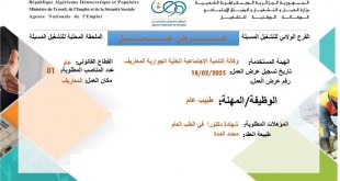 اعلانات توظيف الولايات المعنية: الجزائر، تيبازة، أم البواقي, أولاد جلال, ادرار, الأغواط, البويرة, البيض, الجلفة, الشلف, المدية, المسيلة, المغير, النعامة, الوادي, اليزي, باتنة, بجاية, برج باجي مختار, بشار, بني عباس, تبسة, تقرت, تلمسان, تمنراست, تيارت, تيزي وزو, تيسمسيلت, تيميمون, جانت, جيجل, سعيدة, سيدي بلعباس, …