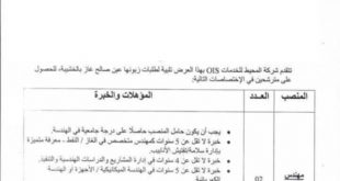 تتقدم شركة المحيط للخدمات OIS بهذا العرض تلبية لطلبات زبونها عين صالح غاز بالخشيبة، للحصول على مترشحين في الاختصاصات التالية: ads المنصب: مهندس مشاريع العدد: 02 المؤهلات والخبرة المطلوبة: المؤهل العلمي: درجة جامعية في الهندسة. الخبرة المهنية: خبرة لا تقل عن 5 سنوات كمهندس …
