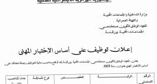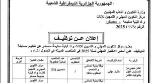 وزارة التكوين والتعليم المهنيين مركز التكوين المهني و التمهين للإناث ولد قبيلة صليحة معسكر ads إعلان عن توظيف يعلن مركز التكوين المهني و التمهين للإناث ولد قبيلة صليحة معسكر عن تنظيم مسابقة للتوظيف على أساس الاختبار المهني لسنة 2025 في المناصب المبينة في الجدول …