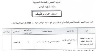 أكمل القراءة »إعلان عن توظيـف بمديرية التعمير والهندسة المعمارية والبناء لولاية الوادي