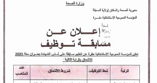 وزارة الصحة مديرية الصحة والسكان لولاية المسيلة المؤسسة العمومية الاستشفائية مقرة ads إعلان عن مسابقة توظيف تعلن المؤسسة العمومية الاستشفائية مقررة عن تنظيم مسابقة على أساس الشهادة بعنوان سنة 2025 للالتحاق بالرتبة التالية: الرتبةنمط التوظيفشروط الالتحاقعدد المناصبطبيب عام في الصحة العموميةعلى أساس الشهادةالمترشحين الحائزين …