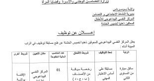 وزارة التضامن الوطني والأسرة وقضايا المرأة المركز النفسي البيداغوجي للأطفال المعاقين ذهنيا خميس الخشنة مديرية النشاط الإجتماعي و التضامن لولاية بومرداس ads إعلان عن توظيف يعلن المركز النفسي البيداغوجي للمعوقين ذهنيا خميس الخشنة عن فتح مسابقة توظيف في الرتب المبينة أدناه: الرتبةنمط التوظيفشروط الالتحاقعدد …