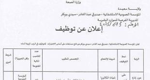 وزارة الصحة المؤسسة العمومية الاستشفائية-صدوقي عبد القادر-سيدي بوبكر ولاية سعيدة ads إعلان عن توظيف تعلن المؤسسة العمومية الاستشفائية-صدوقي عبد القادر-سيدي بوبكر عن فتح مسابقات على أساس الإختبارات للتوظيف في الرتب المبينة أدناه: إعلان عن توظيف بالمجلس الأعلى للشباب: الجزائر العاصمة، البليدة، تيبازة، بومرداس. إعلان …
