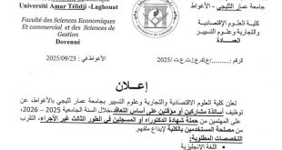 وزارة التعليم العالي والبحث العلمي جامعة عمار ثليجي – الأغواط كلية العلوم الاقتصادية والتجارية وعلوم التسيير ads الأغواط في: 25/09/2025 إعلان تعلن كلية العلوم الاقتصادية والتجارية وعلوم التسيير بجامعة عمار ثليجي بالأغواط، عن توظيف أساتذة مشاركين أو مؤقتين على أساس التعاقد، خلال السنة الجامعية …