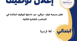 ads إعلان توظيف تعلن مدرسة طيف براقي عن حاجتها لتوظيف أساتذة في المناصب الشاغرة التالية: ابتدائي لغة فرنسية متوسط اجتماعيات لغة إنجليزية شروط المنصب: شهادة جامعية في التخصص قرب السكن الصحة الجيدة عنوان البريد الإلكتروني [email protected] إعلان عن مسابقة توظيف بالمركز الوطني للبحث المطبق …