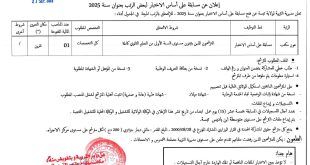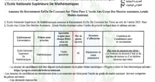 وزارة التعليم العالي والبحث العلمي المدرسة الوطنية العليا للرياضيات إعلان عن مسابقة توظيف على أساس الشهادات للالتحاق بسلك الأساتذة المساعدين ads تعلن المدرسة الوطنية العليا للرياضيات عن فتح مسابقة توظيف على أساس الشهادات للالتحاق برتبة أستاذ مساعد درجة رئيسي، وذلك وفقا للتفاصيل المذكورة أدناه: …