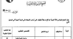 وزارة التعليم العالي والبحث العلمي المجمع الجزائري للغة العربية ads اعلان عن توظيف الجزائر في: 22 سبتمبر 2025 يعلن المجمع الجزائري للغة العربية عن فتح مسابقة توظيف على أساس الشهادات في الرتب المهنية المبينة في الجدول الآتي: الرتبةنمط التوظيفشروط الالتحاقالتخصص المطلوبعدد المناصب المالية المفتوحةأستاذ …