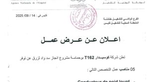 وزارة العمل والتشغيل والضمان الاجتماعي الوكالة الوطنية للتشغيل الفرع الولائي للتشغيل قسنطينة الملحقة المحلية للتشغيل قايس ads قايس في: 14 / 09 / 2025 إعلان عن عرض عمل تعلن شركة كوسيدار T162 بوحامة بمشروع إنجاز سد واد لزرق عن توفر المناصب: 05 مناصب عمل …