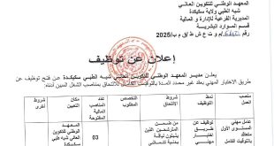 المعهد الوطني للتكوين العالي شبه الطبي ولاية سكيكدة ads اعلان عن توظيف يعلن مدير المعهد الوطني للتكوين العالي شبه الطبي سكيكدة عن فتح توظيف عن طريق الاختبار المهني بعد غير محدد المدة بالتوقيت الكامل للالتحاق بمناصب الشغل المبينة أدناه: إعلان عن مسابقة توظيف بالمركز …