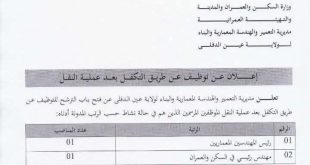 وزارة السكن والعمران والمدينة والتهيئة العمرانية مديرية التعمير والهندسة المعمارية والبناء لولاية عين الدفلى ads إعلان توظيف عن طريق التكفل بعد عملية النقل تعلن مديرية التعمير والهندسة المعمارية والبناء لولاية عين الدفلى عن فتح باب الترشح للتوظيف عن طريق التكفل بعد عملية النقل للموظفين …
