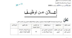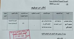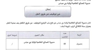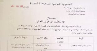 وزارة الفلاحة والتنمية الريفية والصيد البحري مديرية المصالح الفلاحية لولاية بني عباس إعلان توظيف عن طريق النقل ads تعلن مديرية المصالح الفلاحية لولاية بني عباس عن فتح باب الترشح للتوظيف عن طريق التكفل بعد عملية النقل بعنوان سنة 2025 في الرتب المبينة أدناه: الرتبةعدد …
