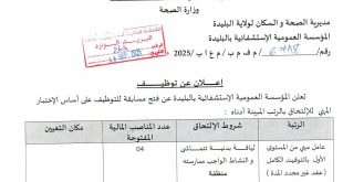 وزارة الصحة مديرية الصحة و السكان لولاية البليدة المؤسسة العمومية الإستشفائية بالبليدة ads إعلان عن توظيف تعلن المؤسسة العمومية الإستشفائية بالبليدة عن فتح مسابقة للتوظيف على أساس الشهادات للإلتحاق بالرتب المبينة أدناه: إعلان عن مسابقة توظيف بالمركز الوطني للبحث المطبق في هندسة مقاومة الزلازل …