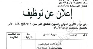الجمهورية الجزائرية الديمقراطية الشعبية وزارة التكوين والتعليم المهنيين مركز التكوين المهني والتمهين العقعاق علي سيق 1 ولاية معسكر ads إعلان عن توظيف يعلن مركز التكوين المهني والتمهين العقعاق علي سيق 1 ولاية معسكر عن فتح اختبار مهني للالتحاق بالمناصب المالية الآتية: نوع الوظائفشروط الإلتحاقعدد …