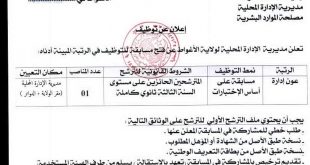 الجمهورية الجزائرية الديمقراطية الشعبية وزارة الأشغال العمومية والبنية التحتية الأساسية مديرية الأشغال العمومية لولاية الأغواط مصلحة الإدارة والوسائل مكتب تدبير الموارد البشرية ads إعلان عن توظيف تعلن مديرية الأشغال العمومية لولاية الأغواط عن مسابقة لولوج الرتب التالية: الرتبةعدد المناصبطريقة التوظيفالشروطالتخصصمهندس دولة في الأشغال العمومية01مسابقة …