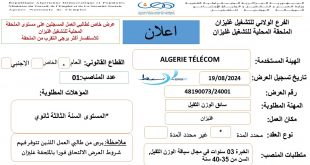 اعلانات توظيف الولايات المعنية: اعلانات توظيف جديدة في ولاية: المدية، البويرة، سطيف، برج بوعريريج، سكيكدة ، الجلفة، تيميمون، النعامة، مستغانم، سيدي بلعباس، الوادي، الشلف يرجى من المهتمين التقرب من الادارة المعنية بالعرض او الملحقة المحلية للتشغيل حسب طبيعة الاعلان ads إعلان عن توظيف جمهورية الجزائر …