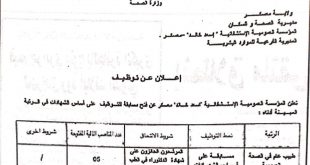 إعلان عن توظيف الجمهورية الجزائرية الديمقراطية الشعبية وزارة الصحة ولاية الجزائر مديرية الصحة والسكان المؤسسة العمومية الاستشفائية إسعد خالد معسكر ads تعلن المؤسسة العمومية الاستشفائية إسعد خالد معسكر عن فتح توظيف في الرتب التالية: طبيب عام في الصحة العمومية 05 ملف الترشيح على الوثائق …