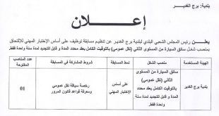 الجمهورية الجزائرية الديمقراطية الشعبية ولاية برج بوعريريج دائرة برج الغدير بلدية برج الغدير إعلان ads يعلن رئيس المجلس الشعبي البلدي لبلدية برج الغدير عن تنظيم مسابقة توظيف على أساس الاختبار المهني للإلتحاق بمنصب شغل سائق السيارة من المستوى الثاني (نقل عمومي بالتوقيت الكامل بعقد …