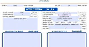 الجمهورية الجزائرية الديمقراطية الشعبية وزارة العمل والتشغيل والضمان الاجتماعي الوكالة الوطنية للتشغيل **الفرع الولائي للتشغيل الطارف عرض عمل ads الهيئة المستخدمة: تعاونية الحبوب والبقول الجافة القطاع القانوني: عام عدد المناصب: 1 تاريخ التسجيل: 15/07/2024 المؤهلات المطلوبة: العمر: بين 35 و 40 سنة المهنة المطلوبة: …